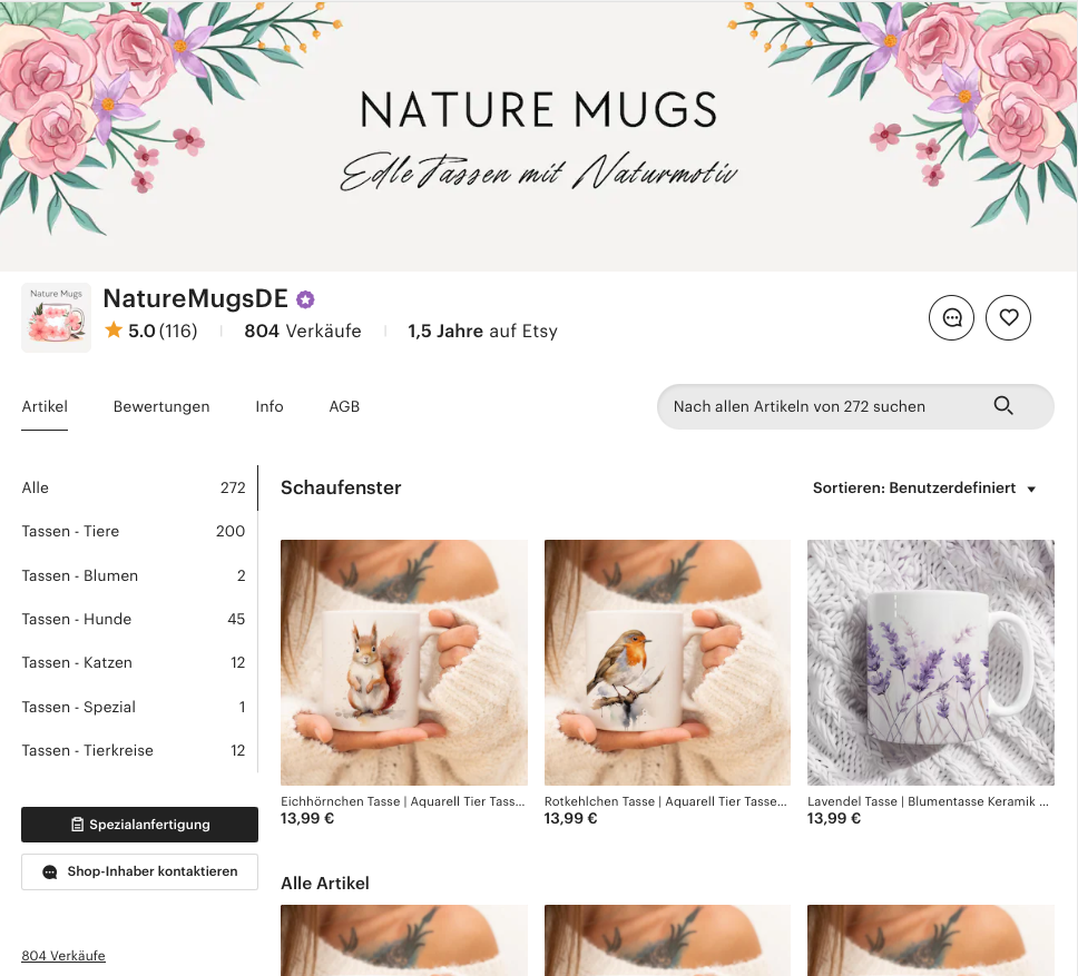 Vor 1,5 Jahren startete der Shop auf Etsy. Bis heute wurden über 800 Tassen verkauft und über 100 5-Sterne Bewertungen gesammelt.